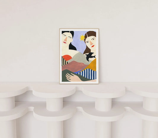 Her work mainly evolves around a world of female figures, flowers and plants… she loves playing with color, light and geometry. She works in many ways, mixing different techniques and mediums. Illustration, ceramic, textile, painting…