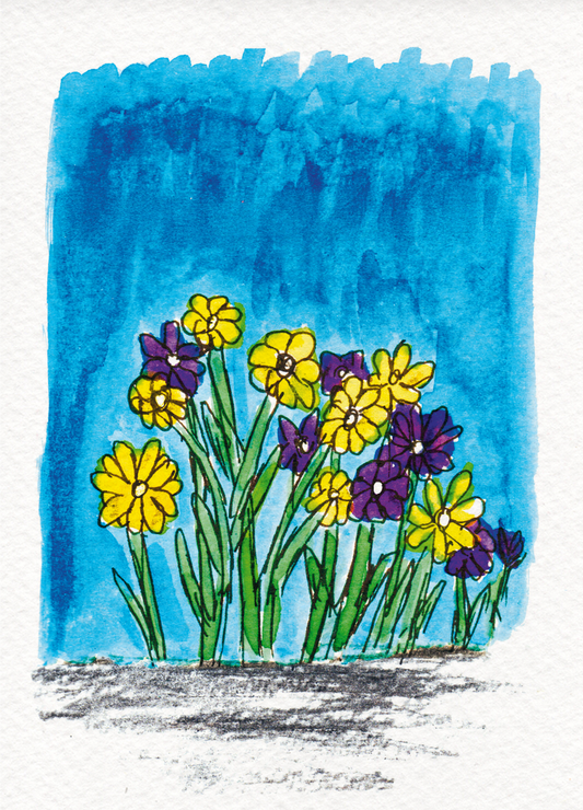 • A6 greeting card titled “De bloemen” by Ilia Claus, featuring hand-drawn yellow and purple flowers with green stems on a textured blue watercolor background. Part of the colorful Ecoline series, printed on 350g card with envelope included.