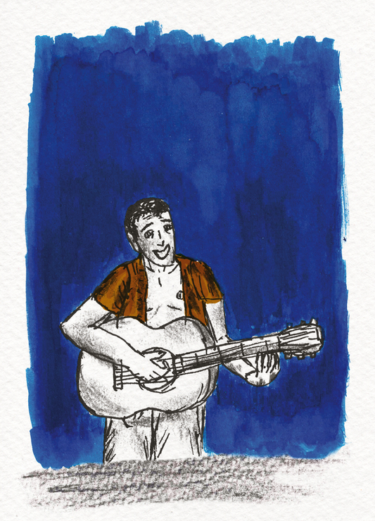 • A6 art card titled “De gitarist” by Ilia Claus, featuring a smiling man playing a guitar, drawn in expressive black lines with watercolor accents. Set against a deep blue hand-painted background. Printed on 350g textured paper, includes C6 envelope.