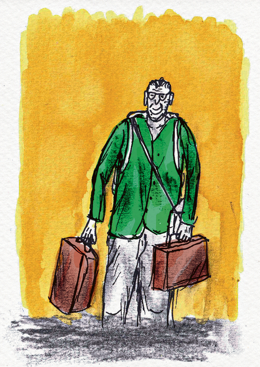 • A6 art card titled “De reiziger” by Belgian illustrator Ilia Claus. Features a man with glasses wearing a green shirt, carrying two brown suitcases against a bright yellow watercolor background. Printed on 350g paper with matching envelope.