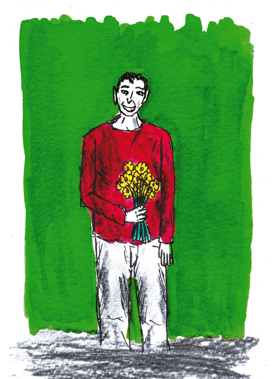 • A vibrant handmade illustration by Ilia Claus showing a smiling man in a red shirt holding yellow flowers, set against a vivid green background – part of the A6 ecoline art card series from Belgium.