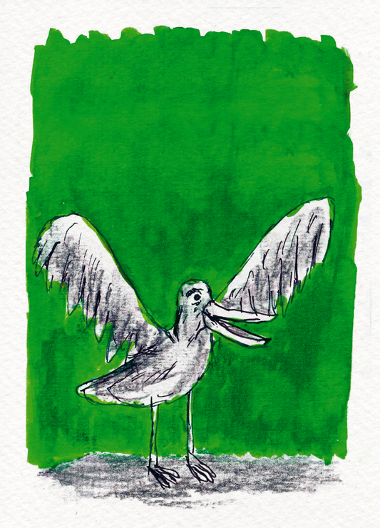 • Black and white hand-drawn bird with wings spread wide against a bold green background – part of Ilia Claus’ whimsical A6 ecoline card series made in Belgium.