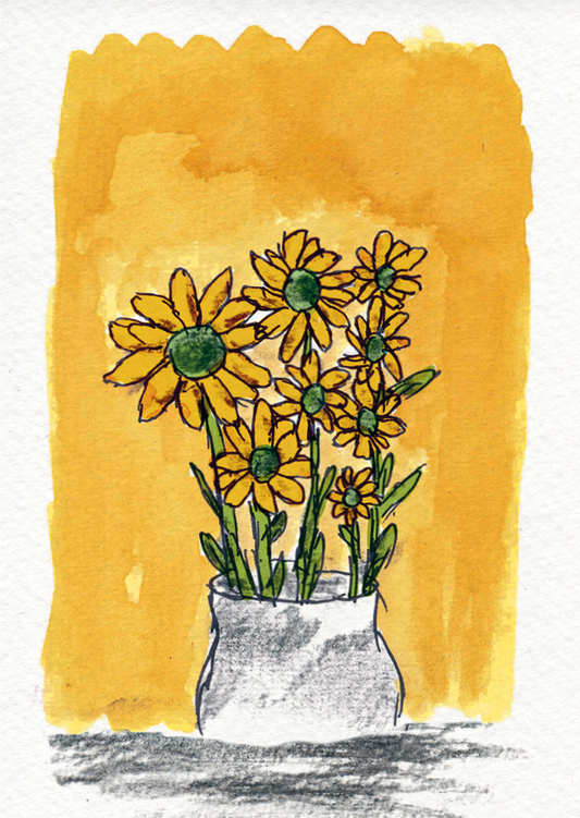 • Illustration of a hand-drawn sunflower bouquet in a white vase, set against a rich yellow background. A cheerful A6 art card by Belgian illustrator Ilia Claus, printed on 350g paper and sold with a matching envelope – perfect for gifting or framing.
