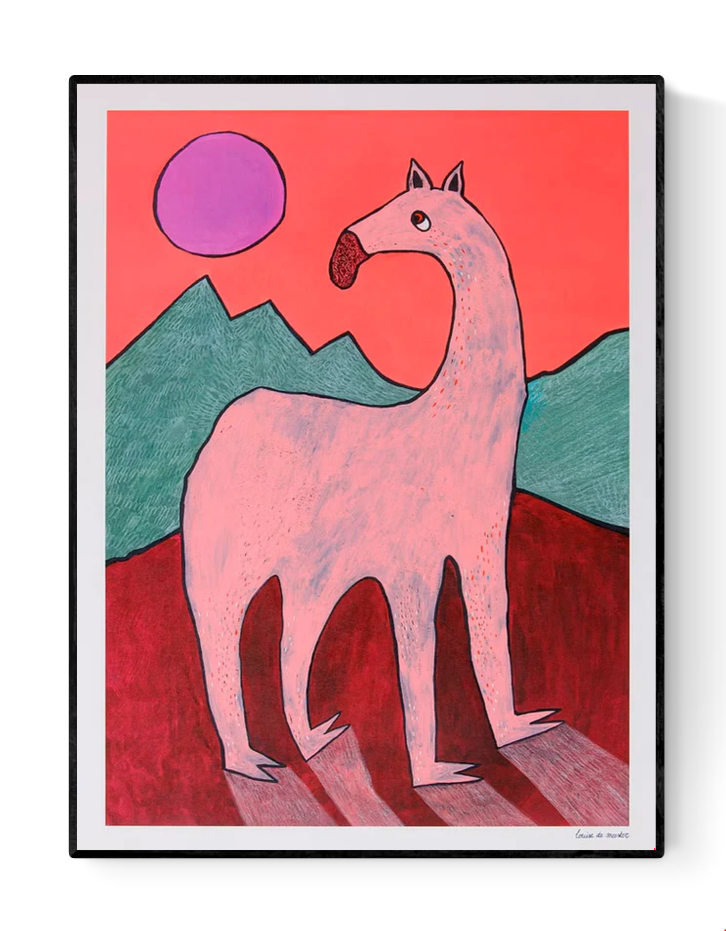 Step into a surreal world with Beest 1, a playful pink creature under a purple sun in a dreamlike landscape. Handmade in Belgium, this bold art print adds color, humor, and imagination to any modern interior.