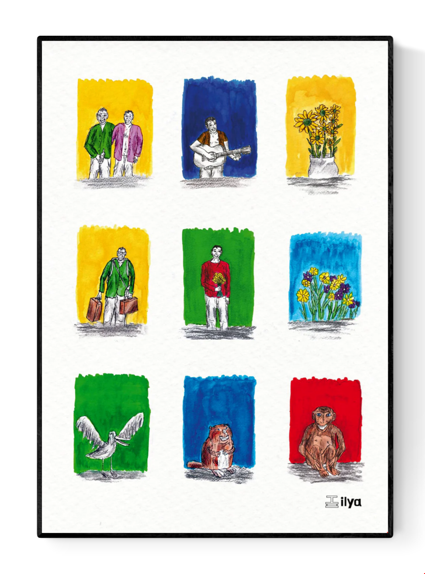 A joyful and colorful A3 art print by Ilia Claus, full of quirky animals and playful human characters. Part of his ‘Ecoline’ series, this vibrant illustration brings charm, humor, and warmth to any space. Perfect for design lovers, illustration fans, and cheerful interiors.