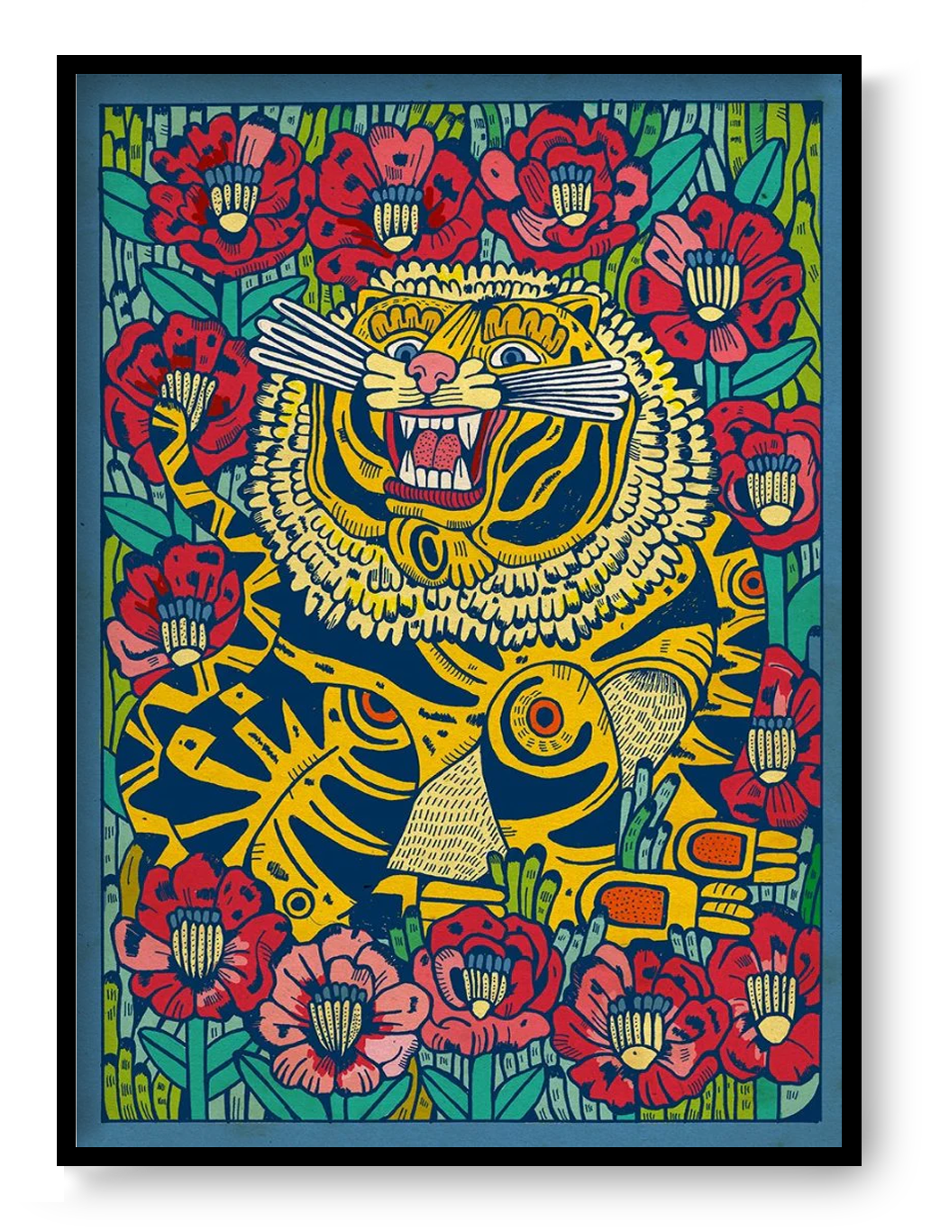 This print shows a wild cat standing proudly in a field of red poppies. The colors are bold, the lines are strong, and the image has a lot of presence without feeling aggressive. It’s the kind of artwork that brings warmth and character to a room and instantly catches the eye.