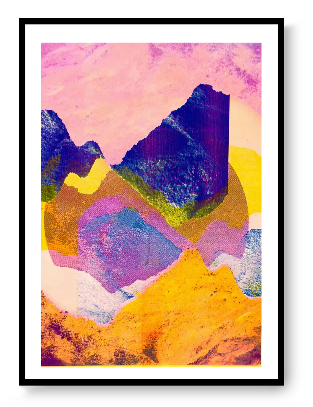 Color first, rules later. Mountain Landscape – Fragments 1.0 breaks the idea of a classic landscape into raw shapes, grain, and movement. This one-off risograph is bold, tactile, and impossible to ignore. Made for walls that need character, not decoration.